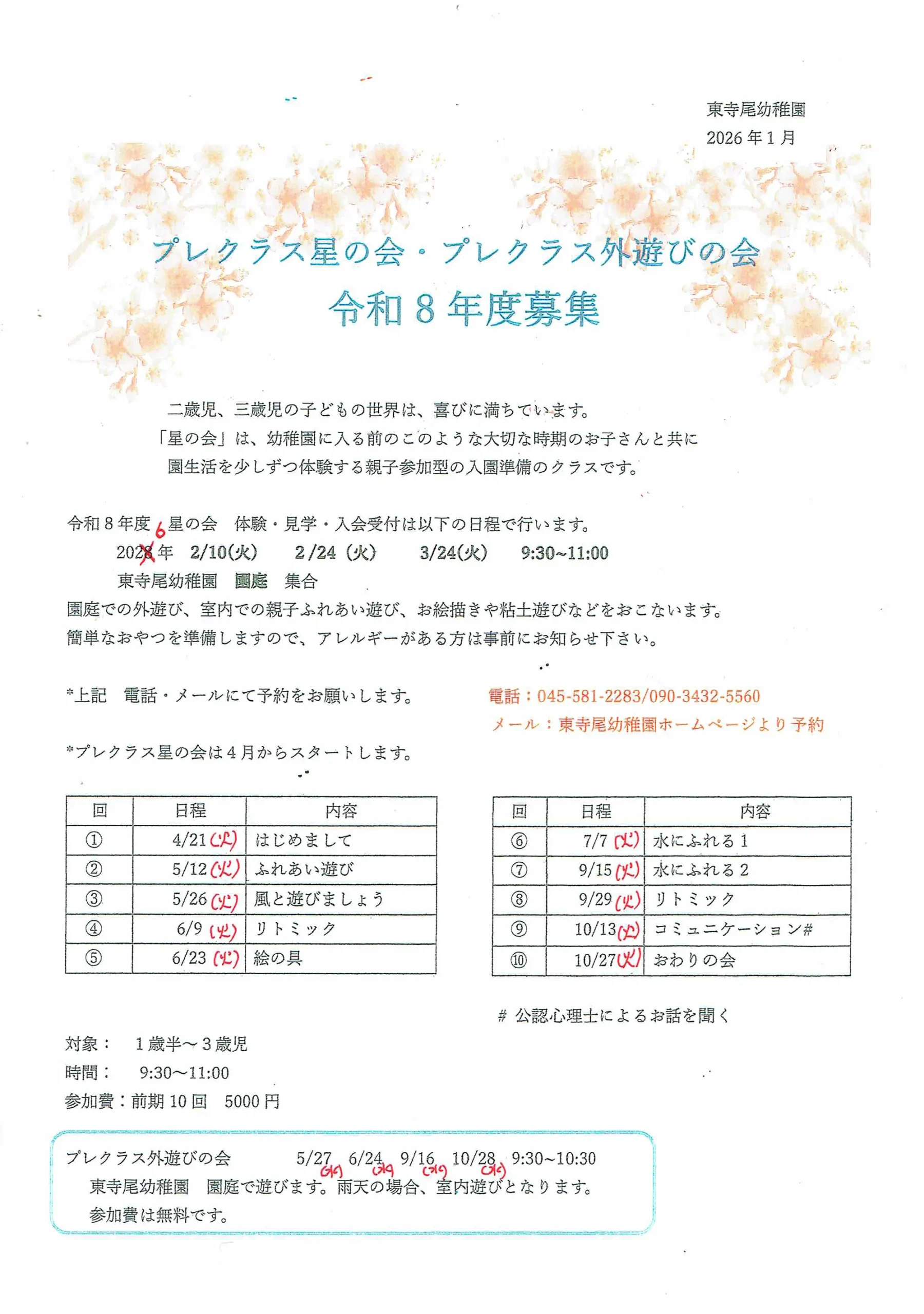 *定員となり次第、締め切ります。*空き状況は電話にてお問い合わせください。